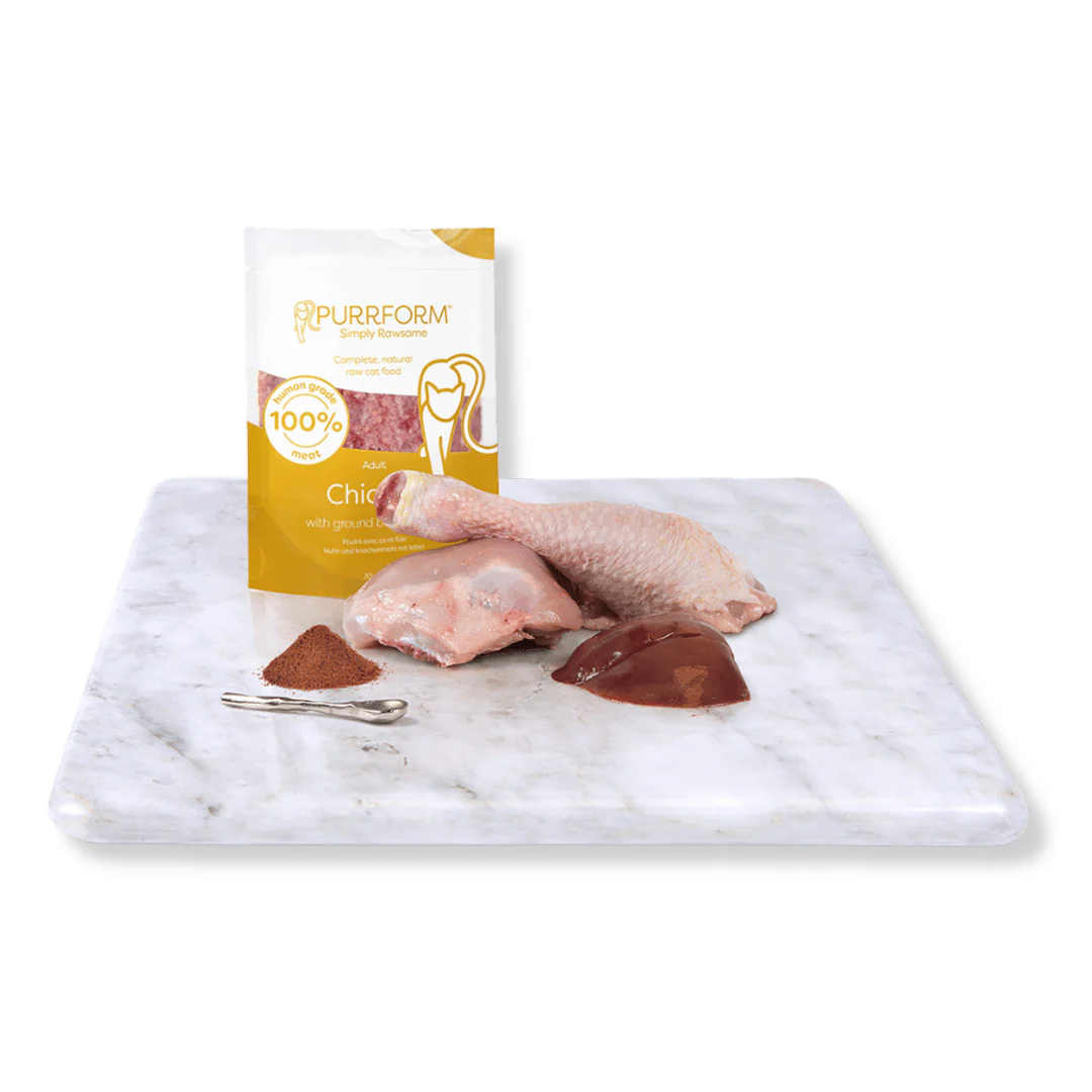 Purrform Chicken and Bone with Chicken Liver is a complete natural pet food for adult cats that contains nothing more than the ingredients listed.